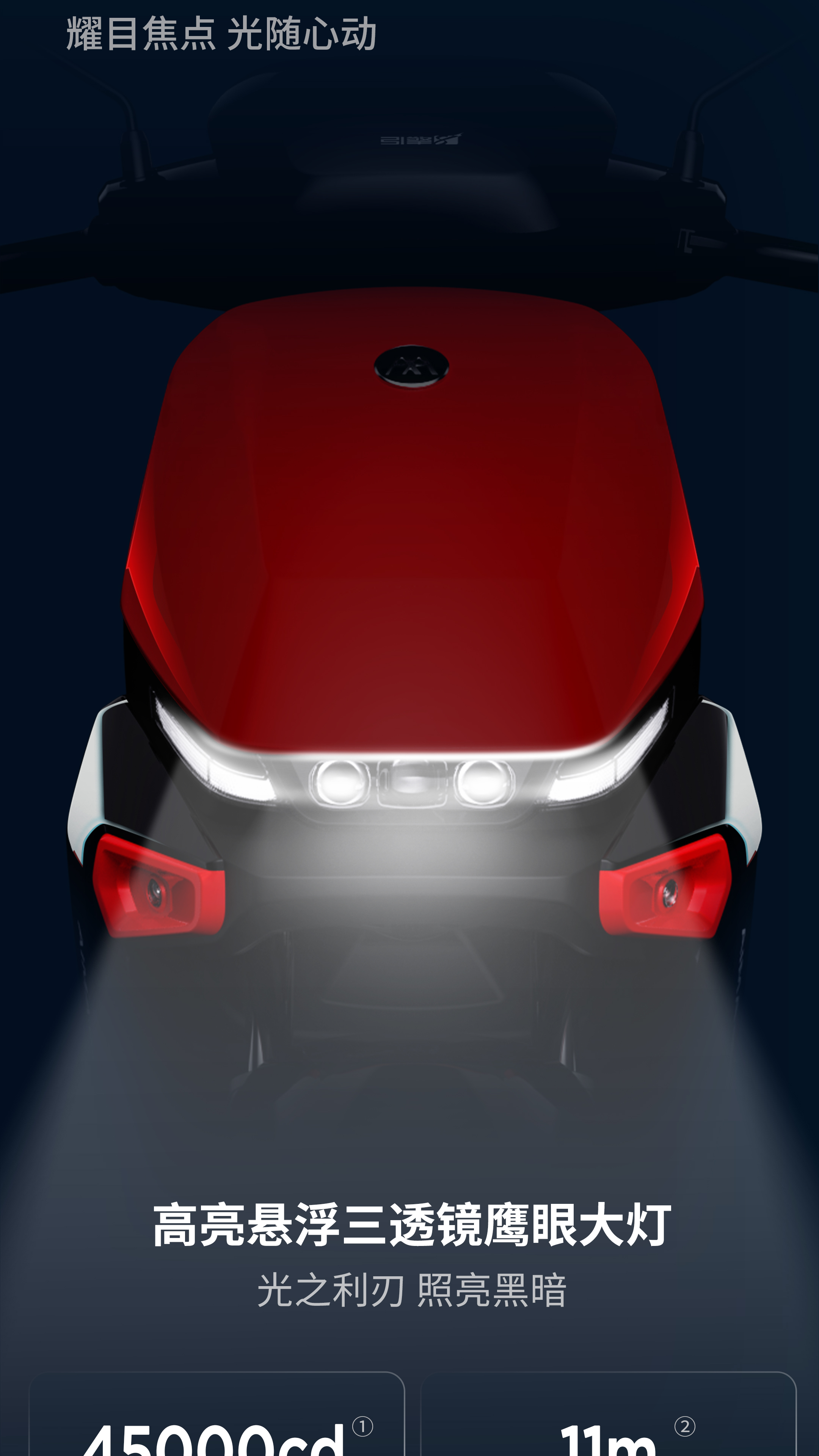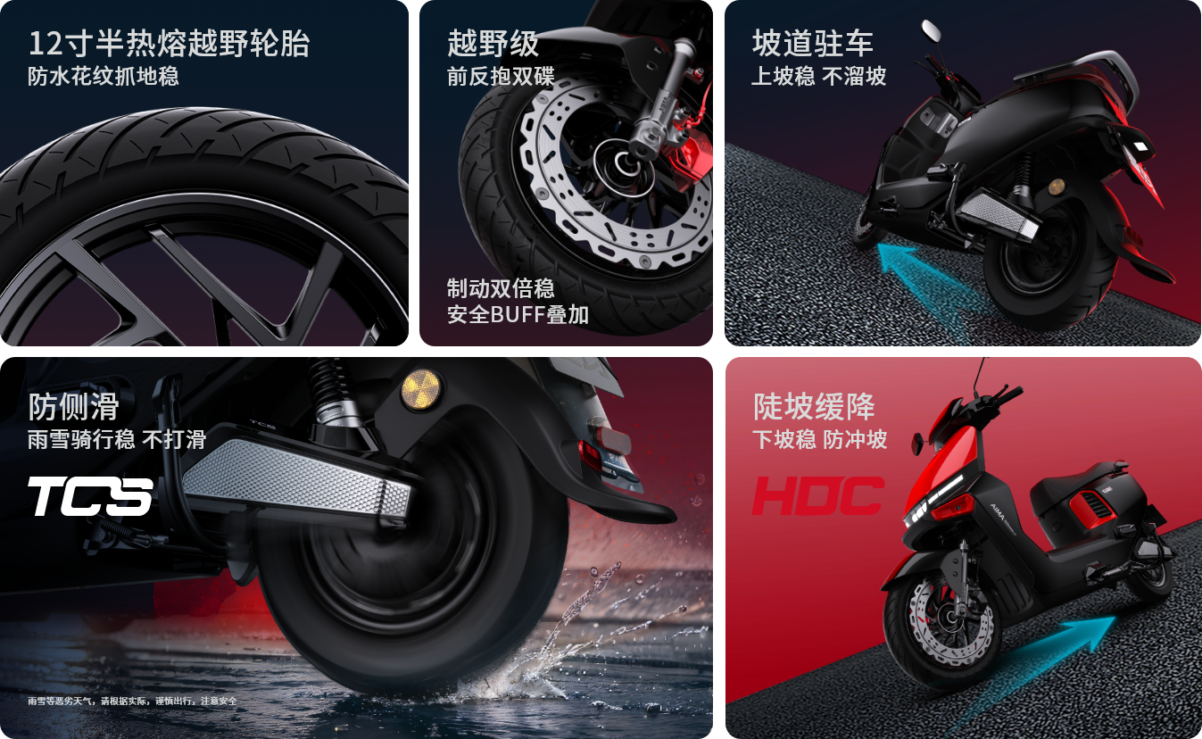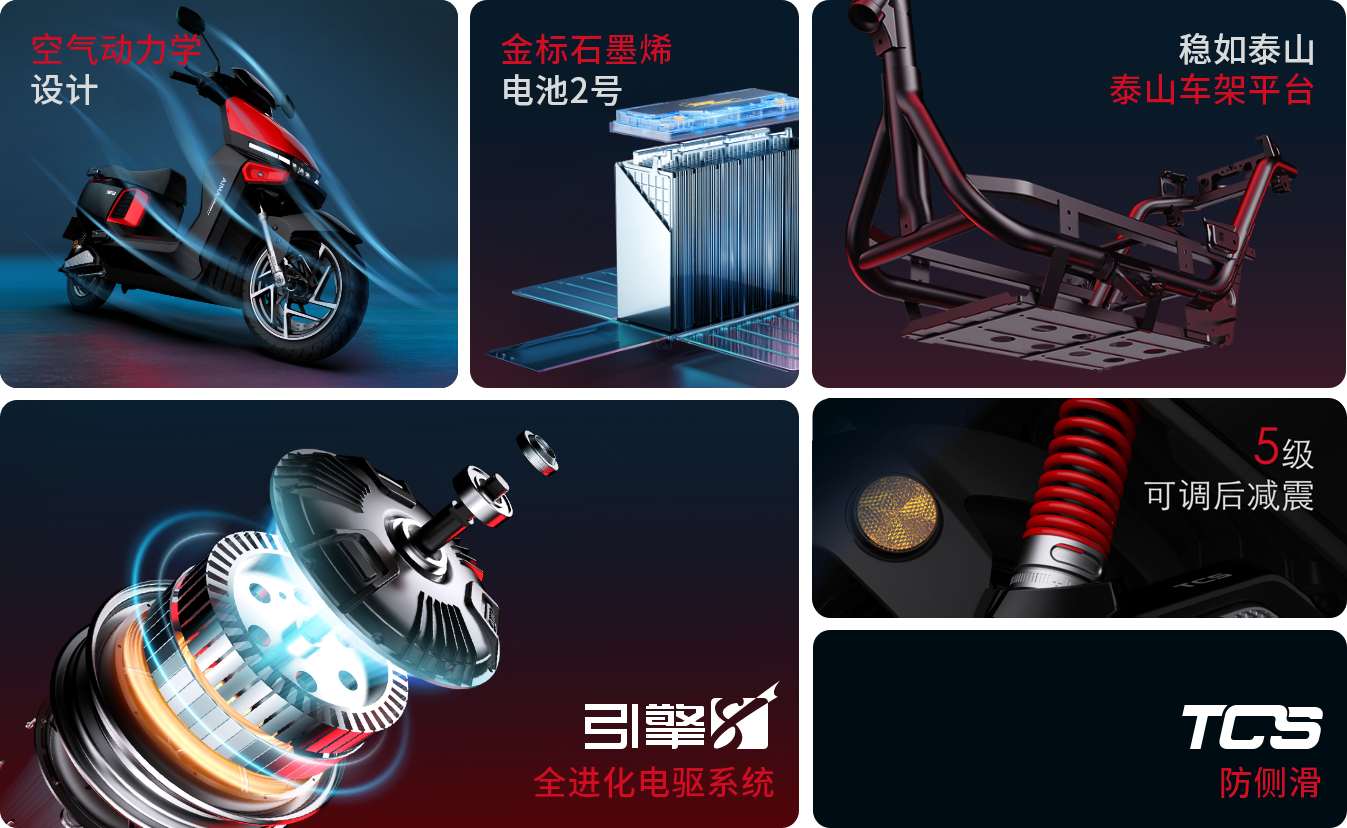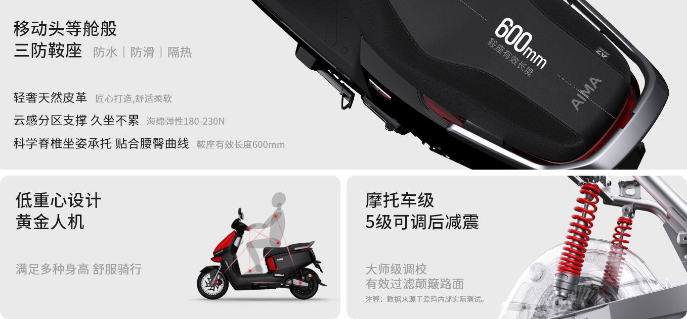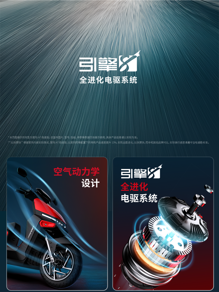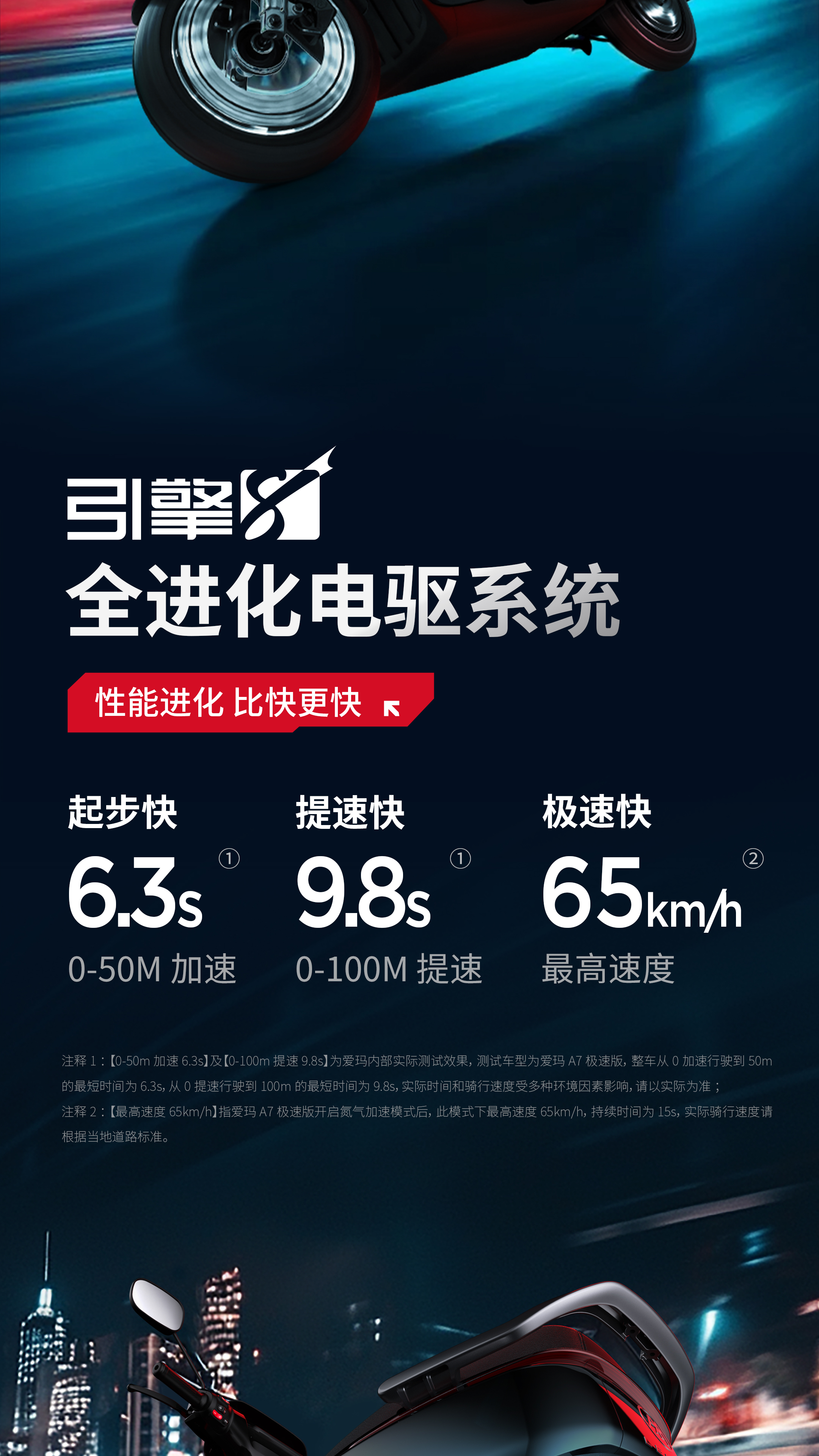 注釋2:【最高速度65km/h】指開云體育A7極速版開啟氮氣加速模式后,此模式下最高速度65km/h,持續(xù)時間為15s,實際騎行速度請根據(jù)當(dāng)?shù)氐缆窐?biāo)準(zhǔn)。